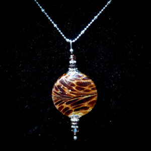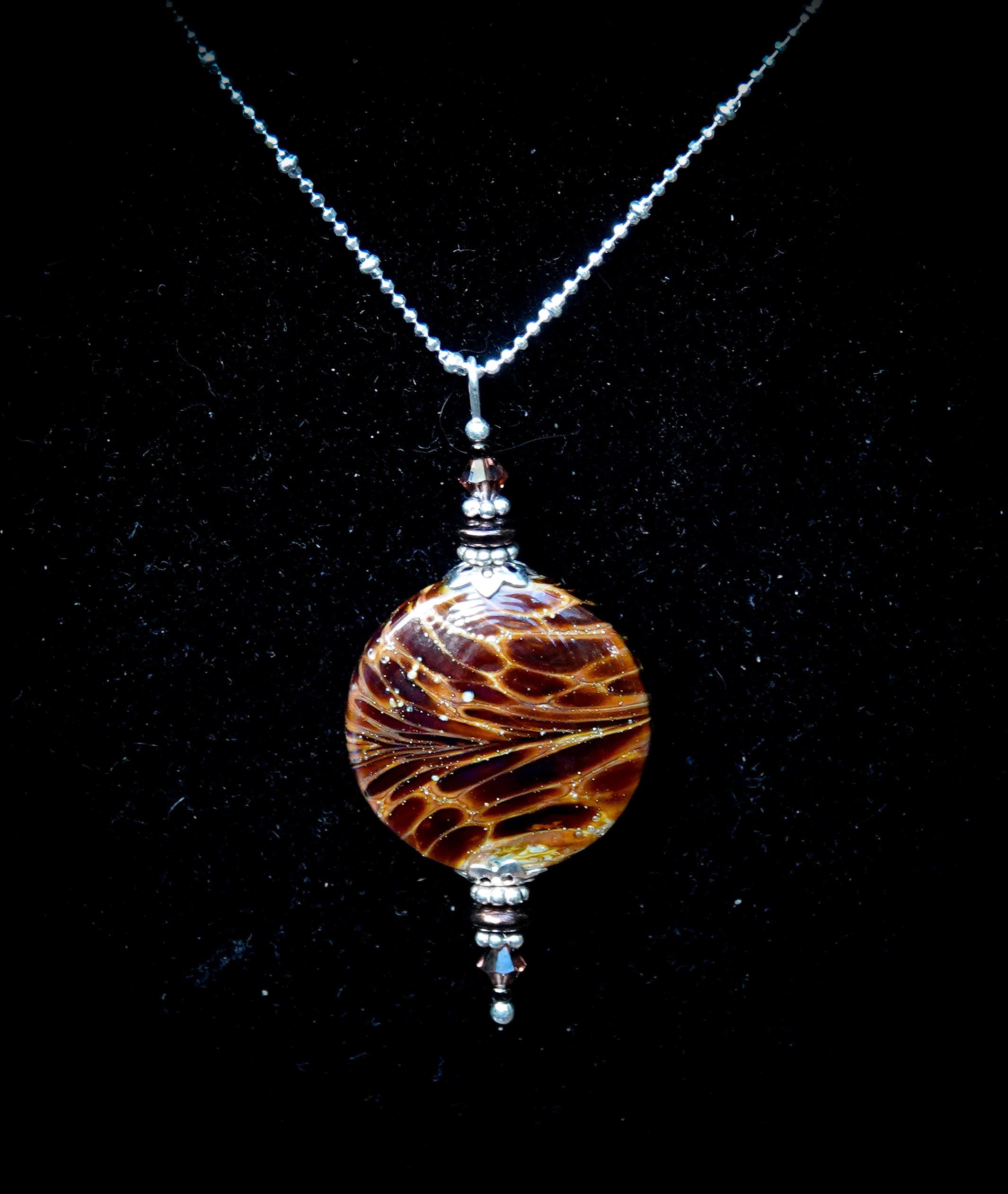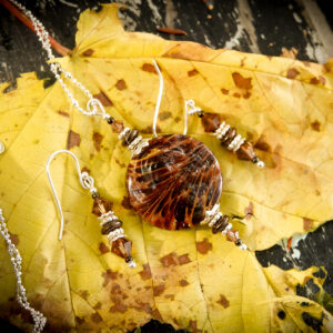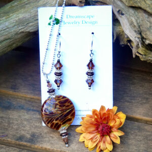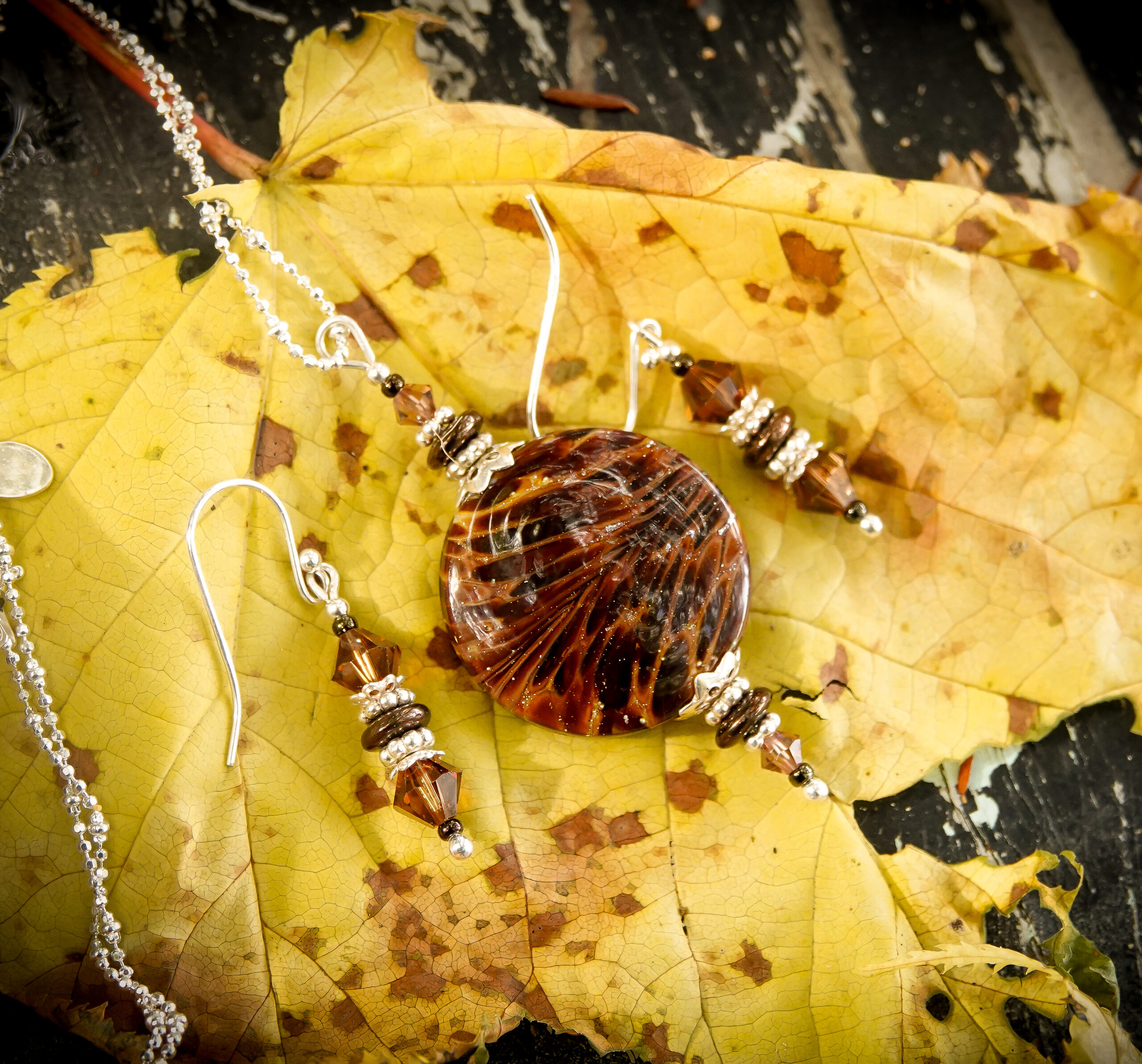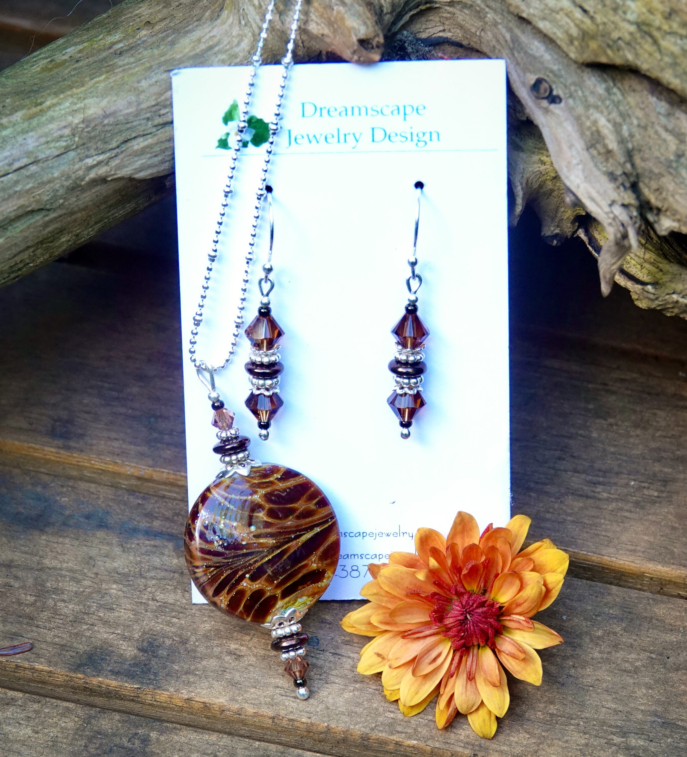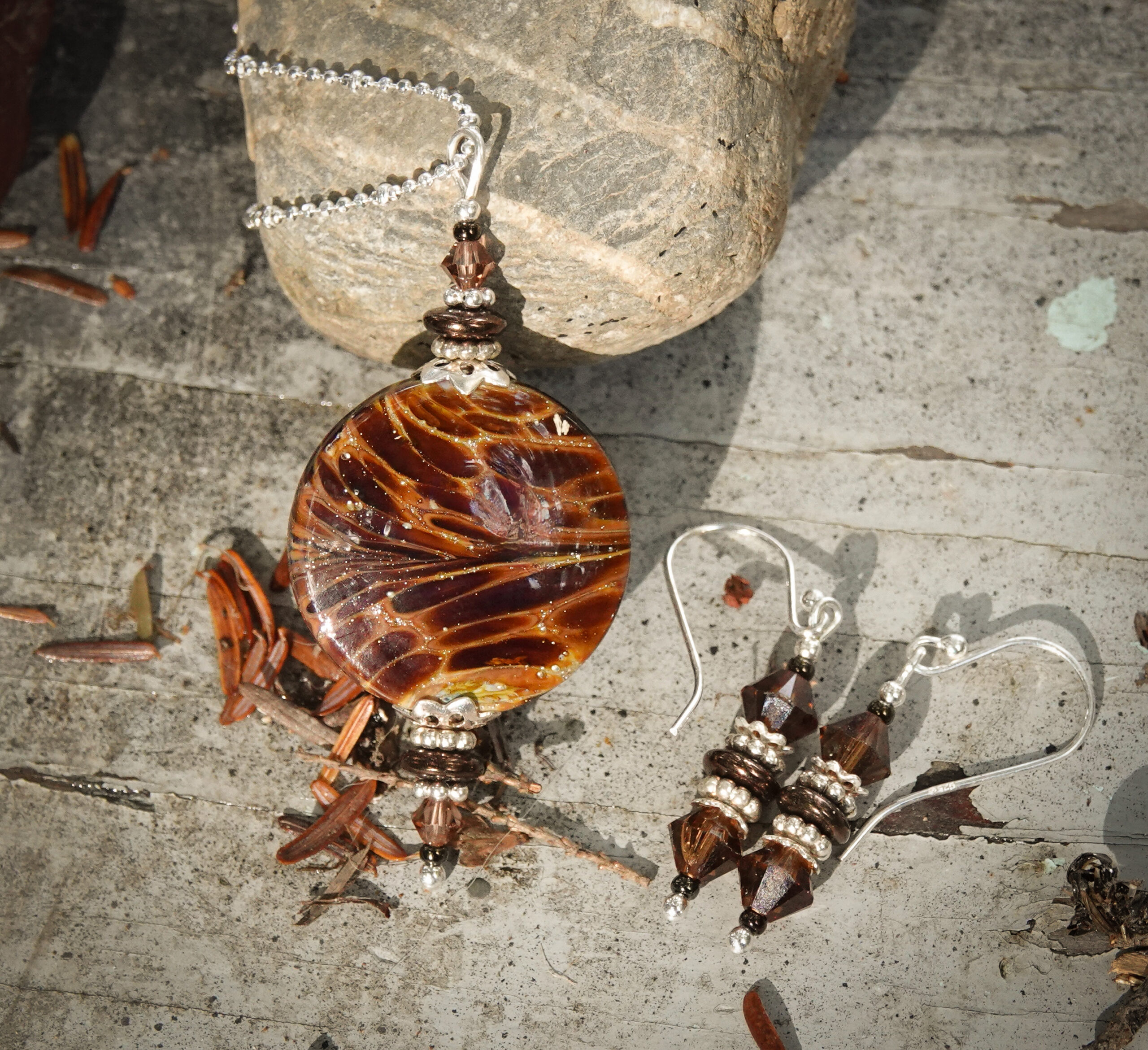 Memories of the sweetness of hot fudge with caramel swirls was the inspiration for our Chocolate Decadence necklace set. The one-of-a-kind necklace features a vivid Artisan lampwork* bead by artisan Sheryl Kelsey, with delicious swirls of gold and chocolate brown. The unique focal lampwork bead is paired with Swarovski crystals in golden brown, Czech glass in dark bronze, and sterling silver beads. This The 2 -inch by 1-inch Chocolate Decadence pendant is suspended on an 18-inch, sterling silver chain and is accompanied by a pair of 1 5/8-inch coordinating, sterling silver earrings.