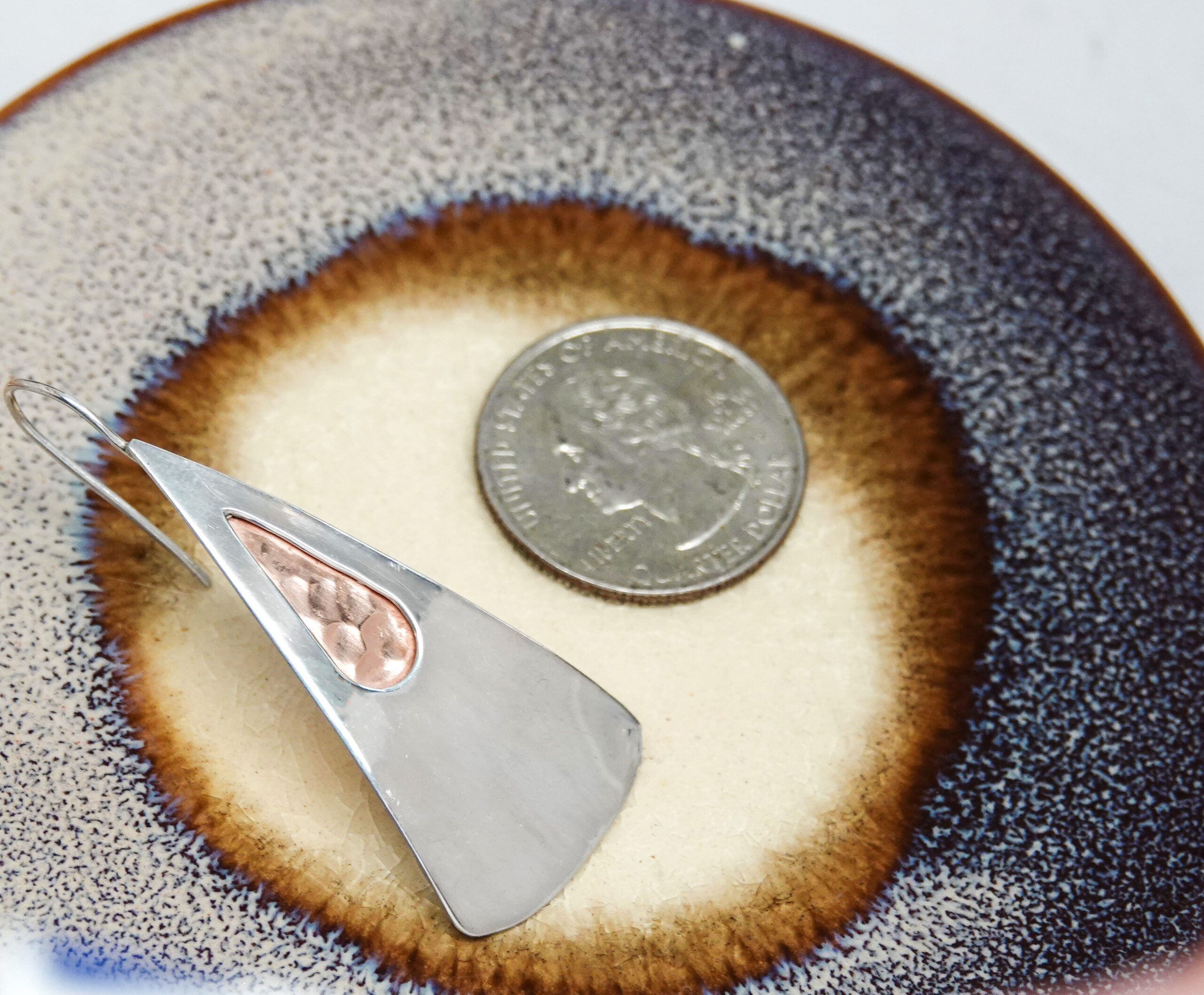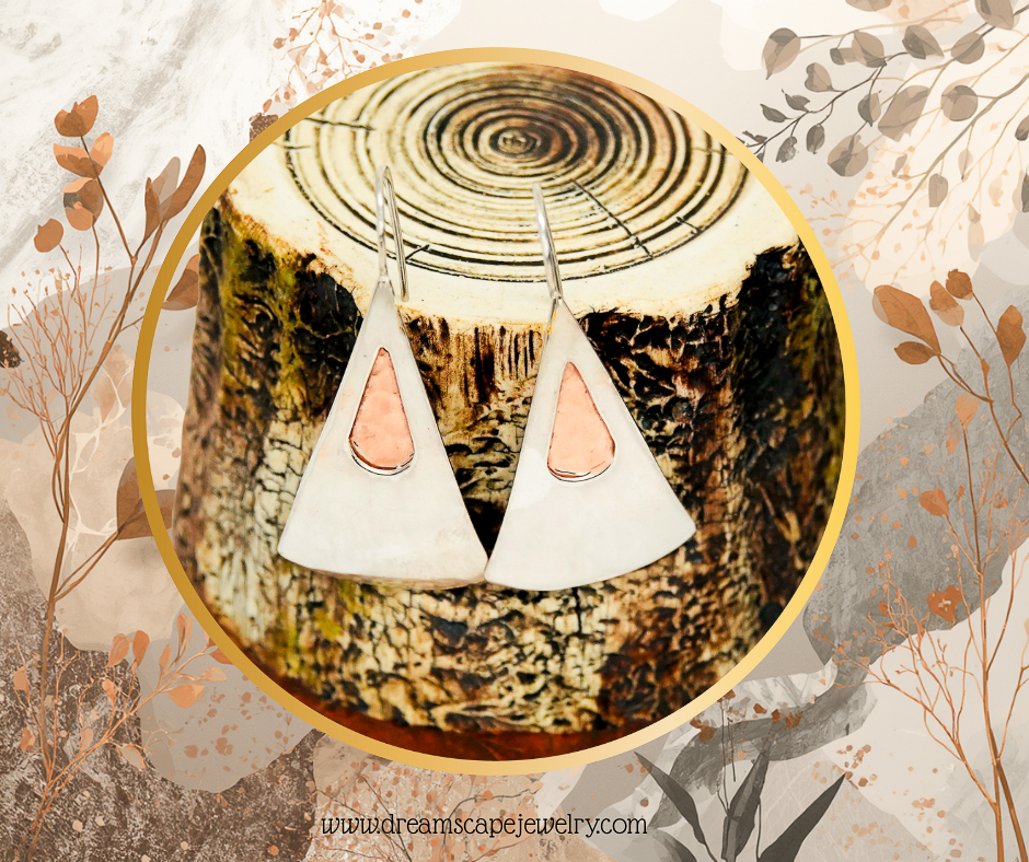 Duality is about the co-existence or interplay of two contrasting elements. Our one-of-a-kind, handcrafted Duality Earrings are 1 3/4-inch long and one-inch at the base of the sterling silver triangles. The shimmer of sterling silver paired with the richness of copper textured teardrops, provide a dramatic contrast, while celebrating the beauty of both.