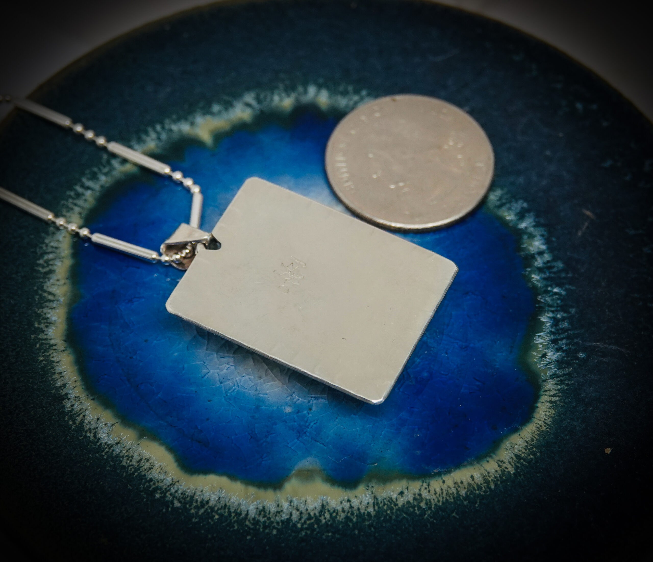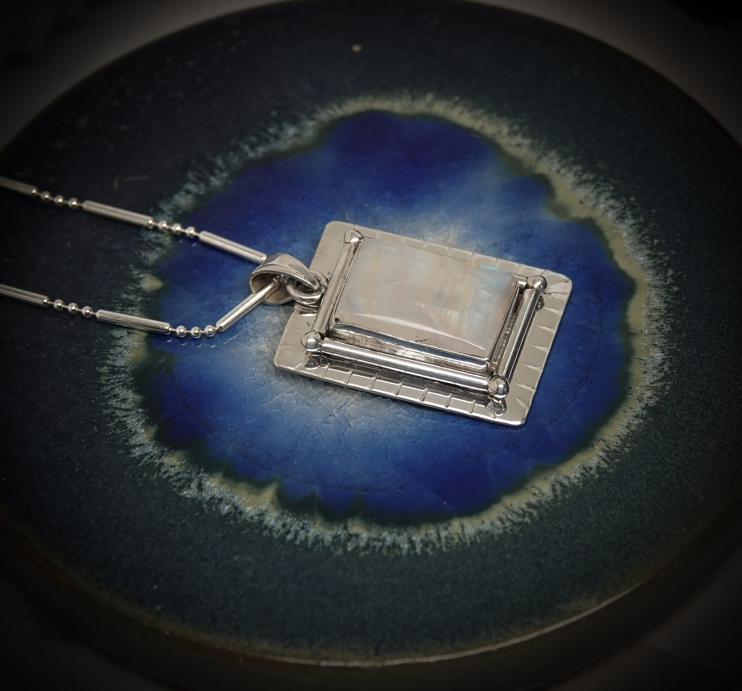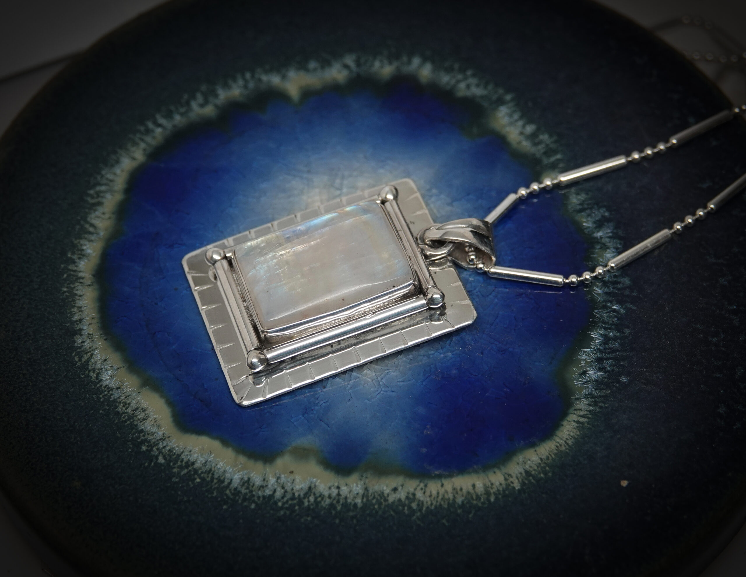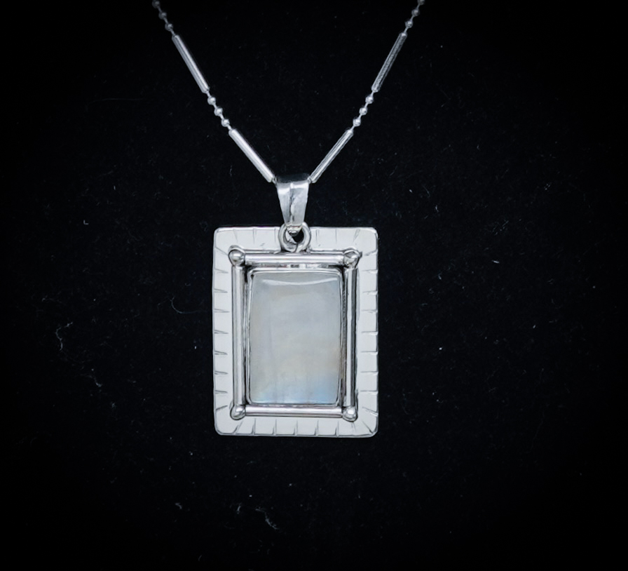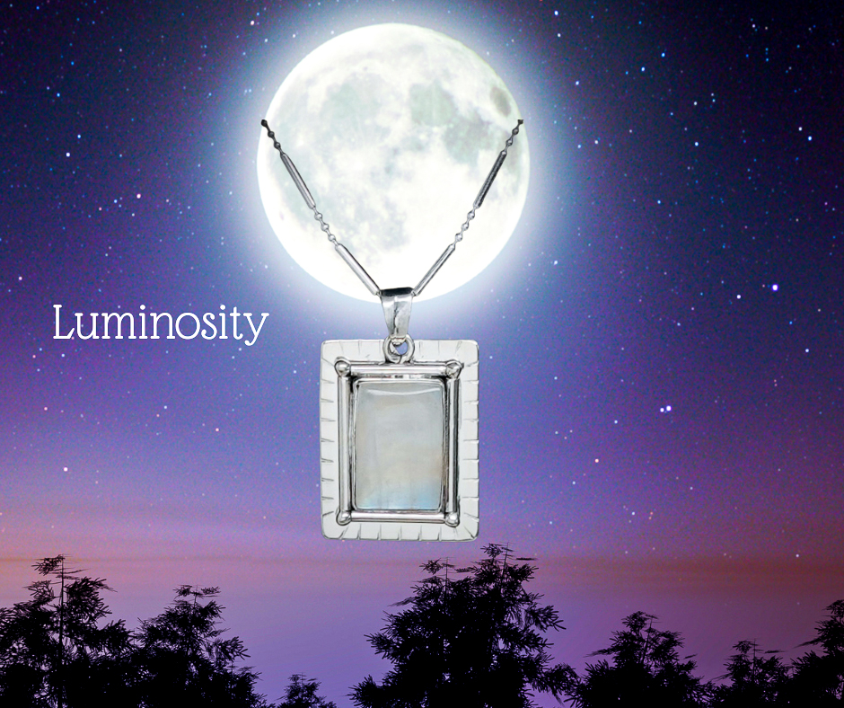 A definition of luminosity is the quality of something that gives off light and/or shines with reflected light. Our one-of-a-kind Luminosity necklace features a handcrafted sterling silver necklace with 21 carats of Rainbow Moonstone, which shimmers colors that reflect in the light. The Luminosity 1 5/8 inch by 1-inch pendant is suspended on an 18-inch sterling silver chain. On the back of the pendant, you can find our Dreamscape Jewelry Design logo, ensuring this is an original design.
