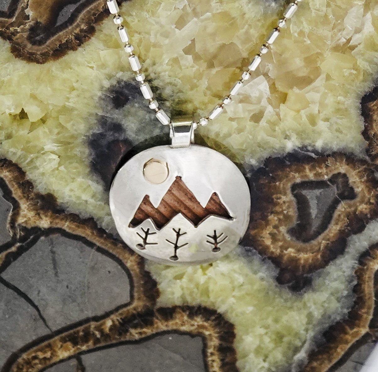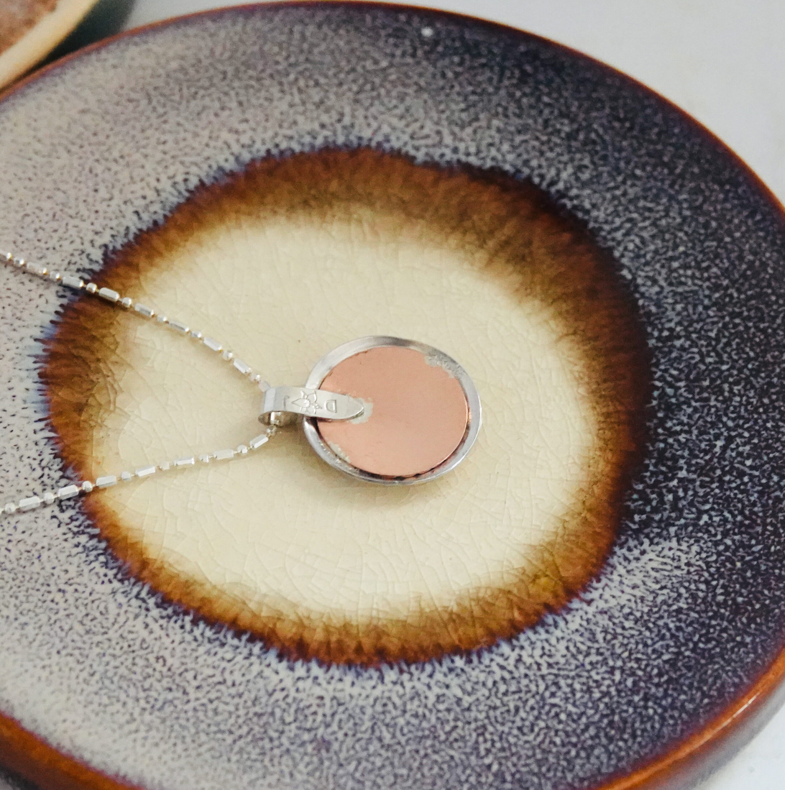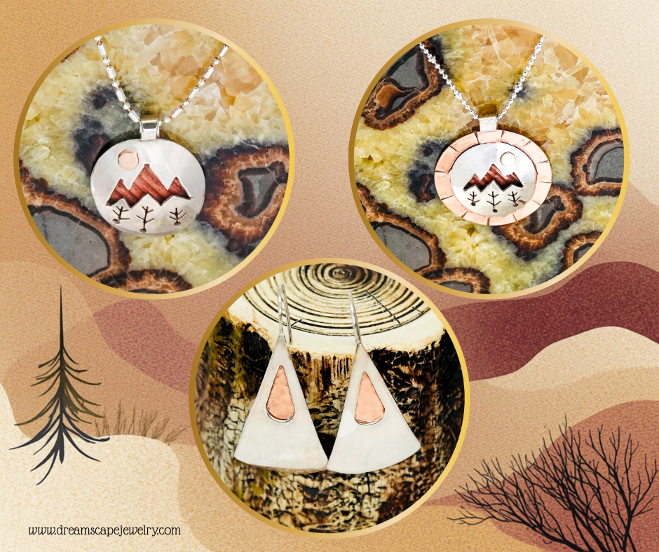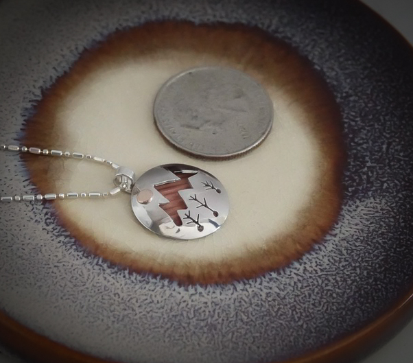 A medley refers to a combination or mixture. Our one-of-a-kind Medley necklace features a medley of three different precious metals: bronze, copper and sterling silver. The 1-inch by 3/4-inch handcrafted pendant has a copper backdrop peeking through a sterling silver dome with a bronze sun glimmering down. Medley is suspended on an 18-inch sterling silver chain. Our Dreamscape Jewelry Design logo is stamped on the backside of the bail, ensuring this is an original design.