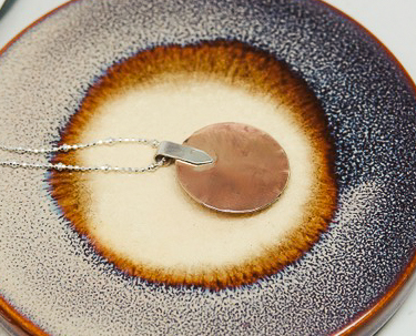 A melange is a blend or combination. Our Melange necklace features a melange of bronze, copper and sterling silver in a handcrafted, 1 1/8 by 1-inch pendant. Textured copper glimmers through the mountain and tree cut-outs, while the sterling silver dome with a bronze moon, is surrounded by etched bronze with a sterling silver bail. Melange is suspended on an 18-inch sterling silver chain. A tiny, sterling silver tag bears our Dreamscape Jewelry Design logo, ensuring this is an original design.