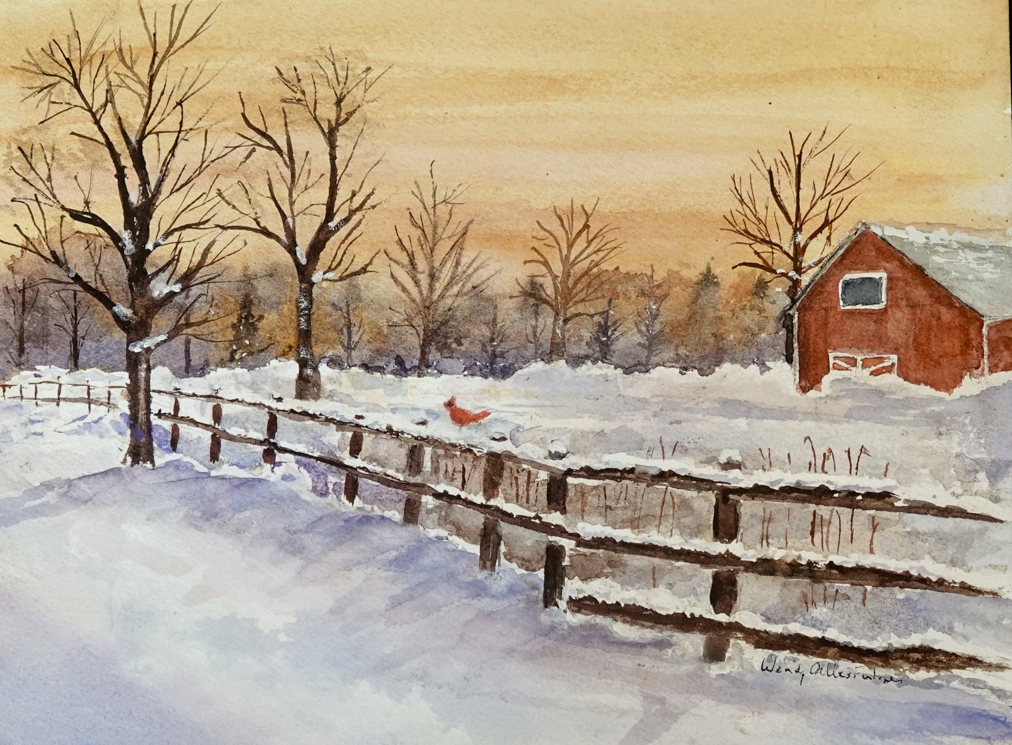 This original watercolor of a Winter scene also features a Northern Cardinal. The cardinal has a number of meaningful symbols. It is seen as a symbol of hope and joy, new beginnings, particularly during challenging times like during the bitter cold of winter.