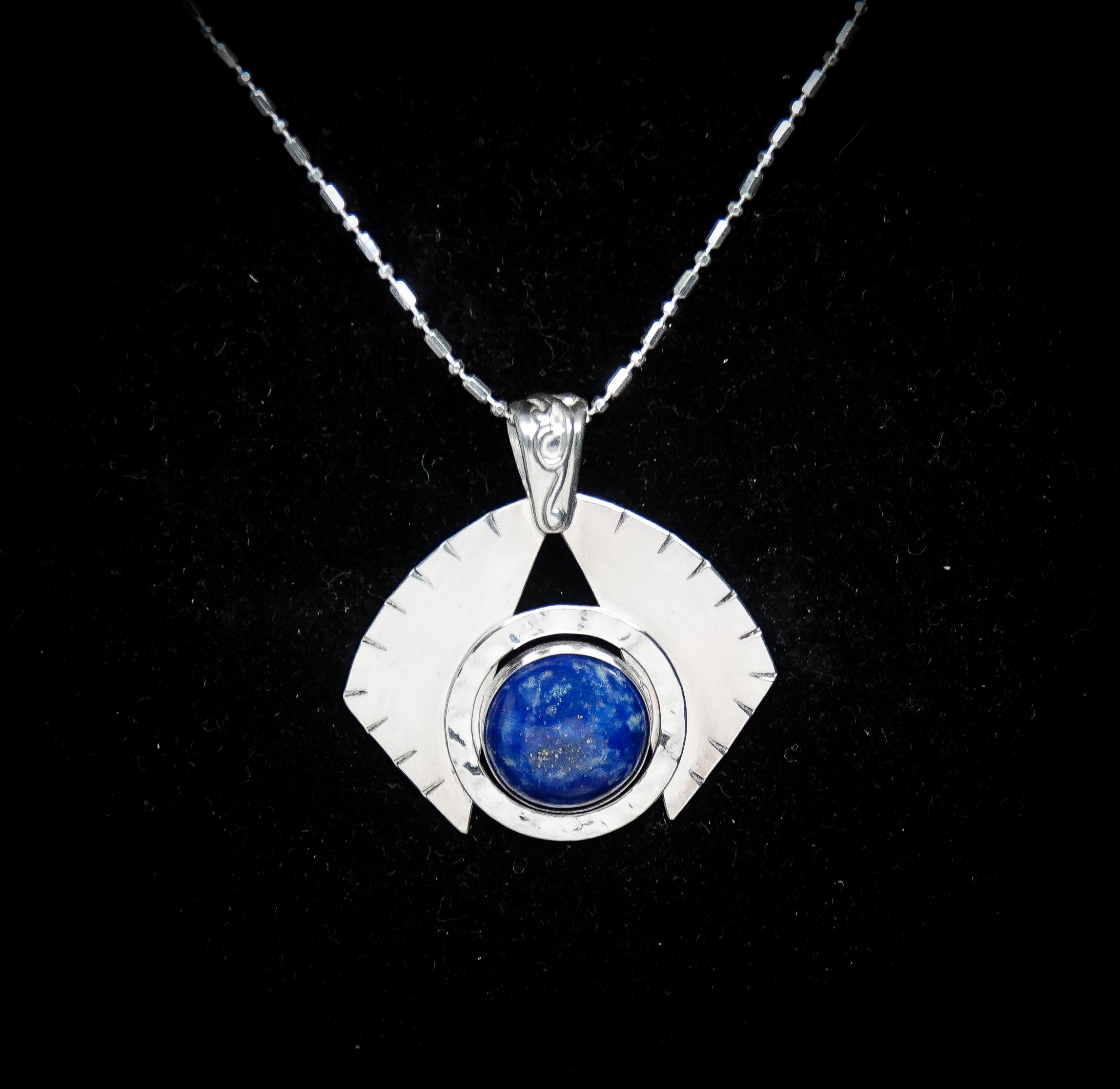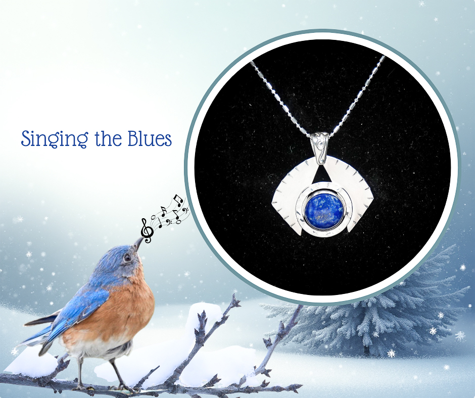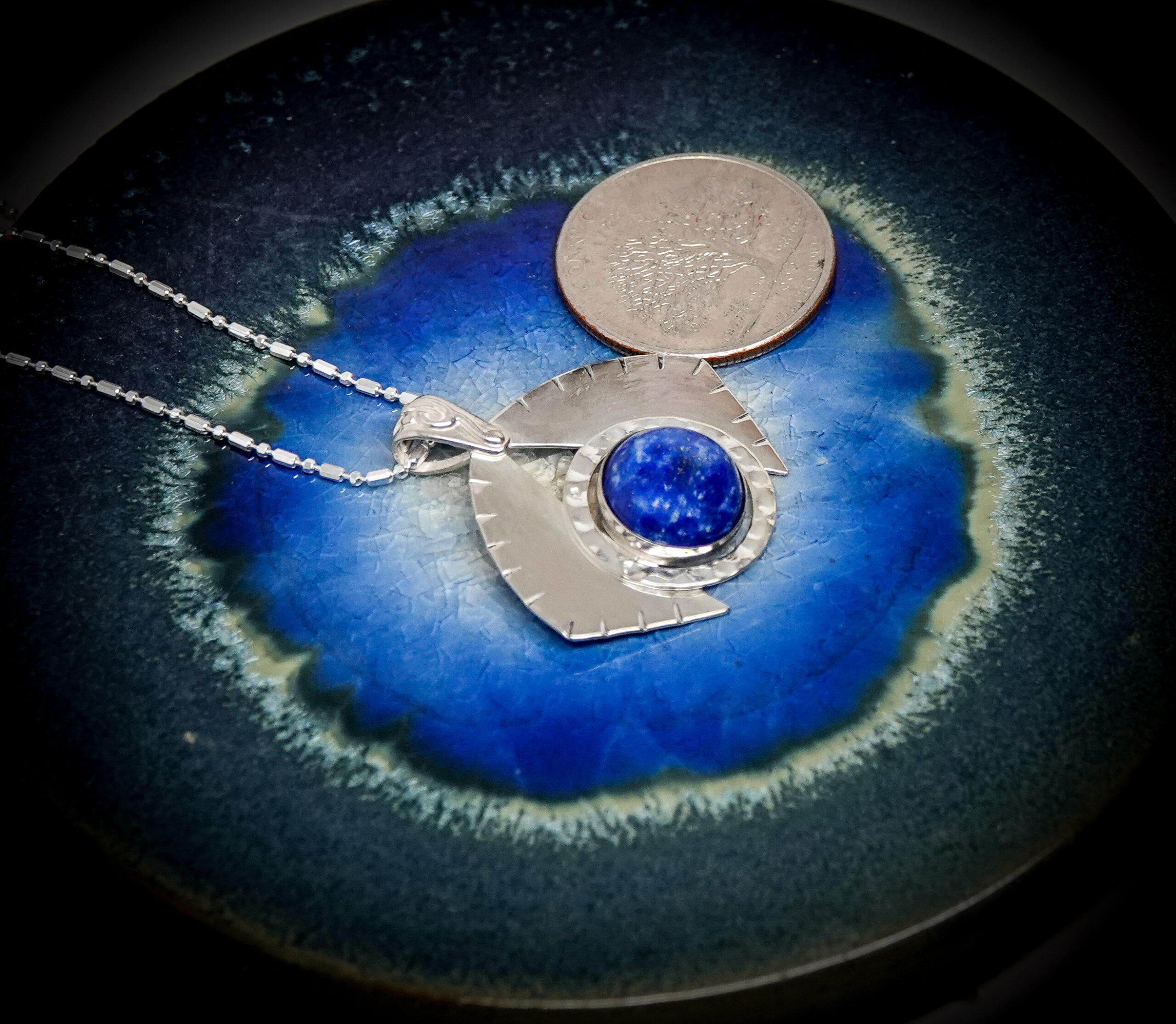 We’re singing about the beautiful blue in Lapis Lazuli, in our one-of-a-kind, handcrafted Singing the Blues necklace. The 1 1/4 by 1 1/4- sterling silver pendant features 7.6 carats of a vibrant Lapis Lazuli cabachon. The unique pendant is suspended on an 18-inch, sterling silver chain. On the back of the pendant is our Dreamscape Jewelry Design logo, ensuring this is an original design. If you wish to add a two-inch extender for versitality of wear, please indicate you choice when ordering.