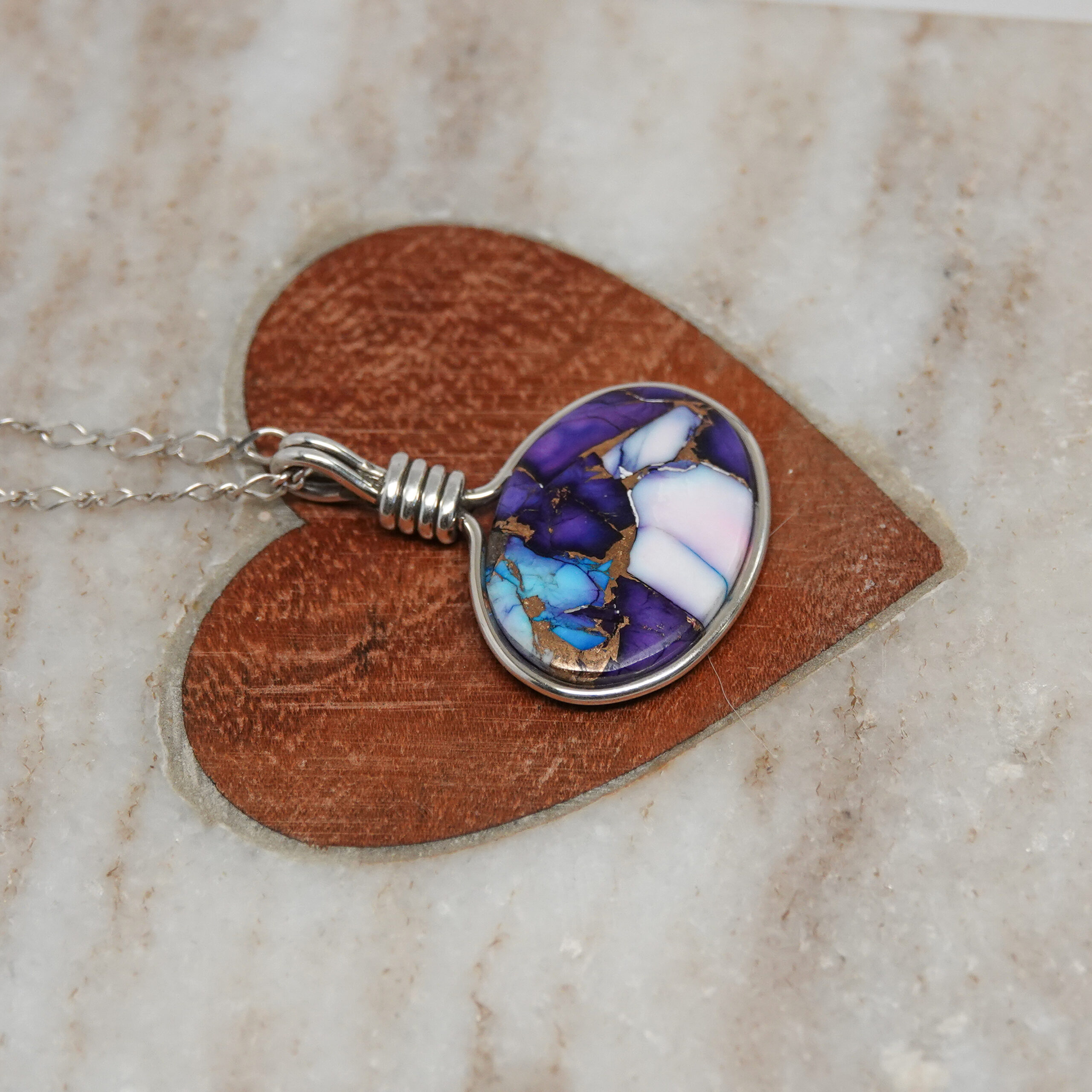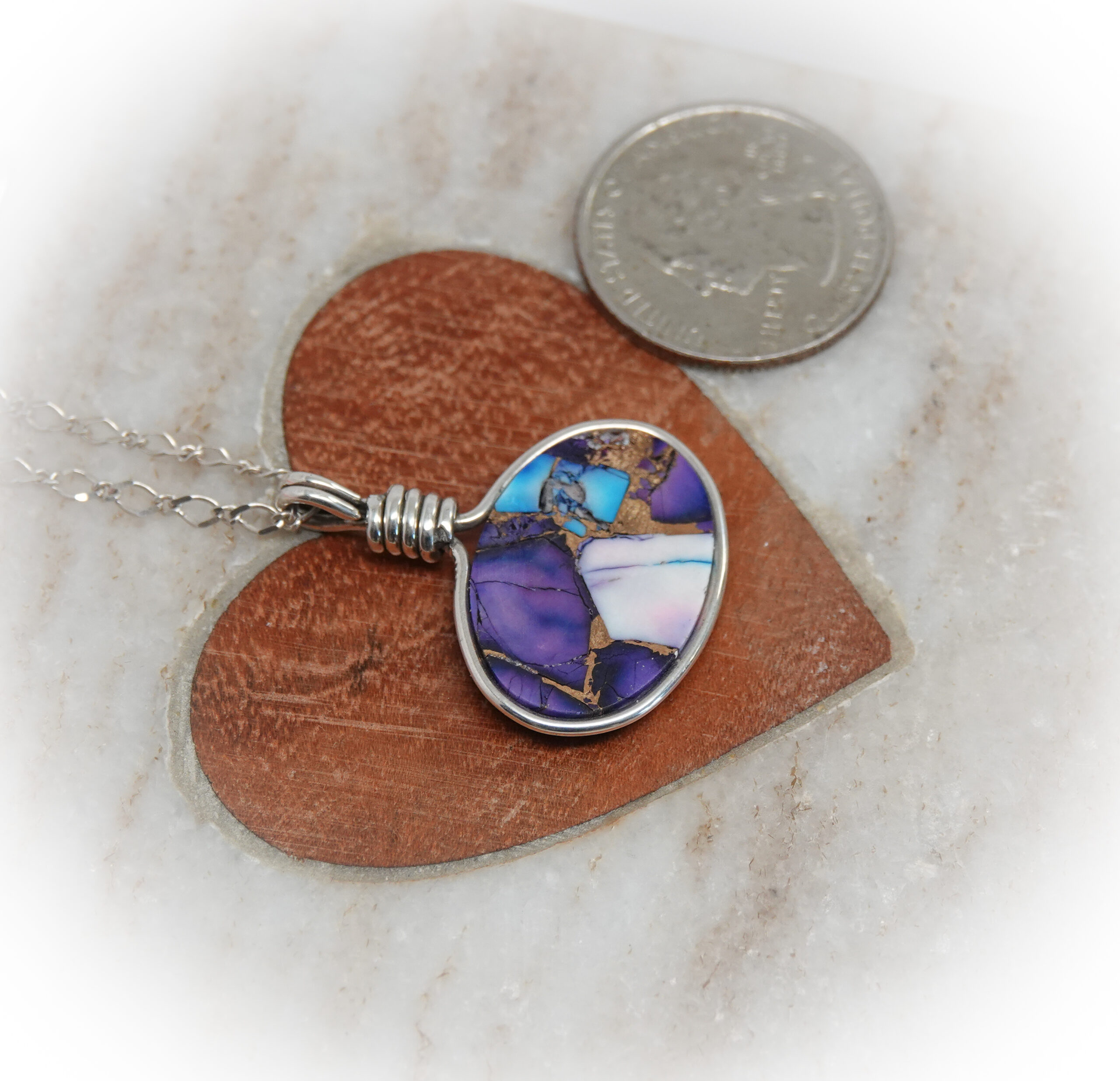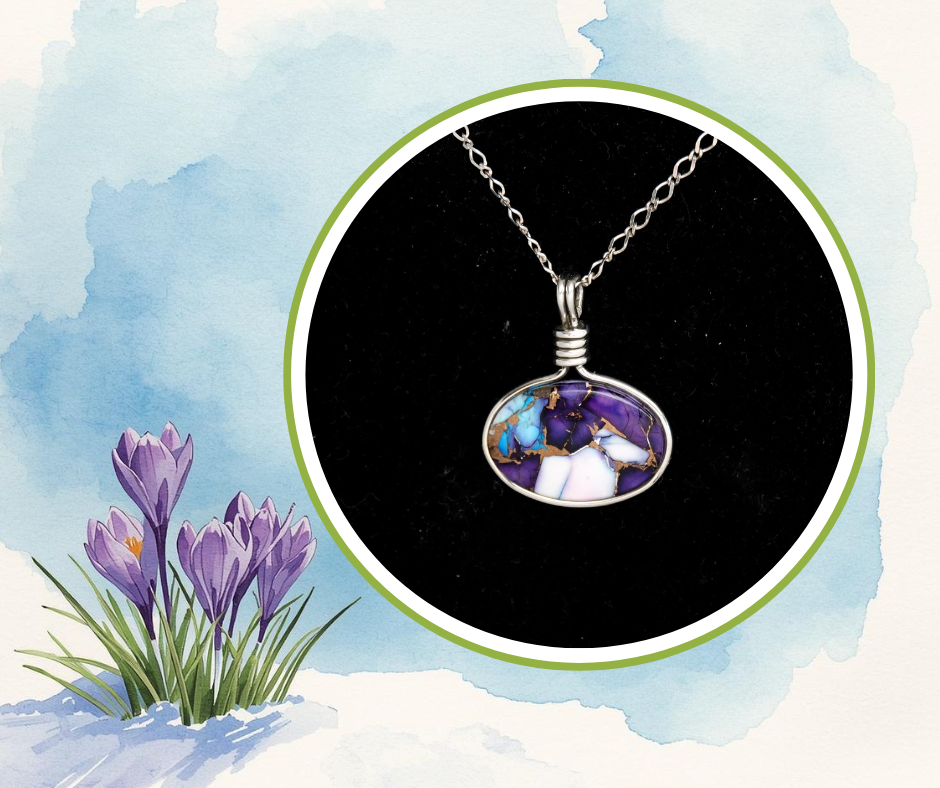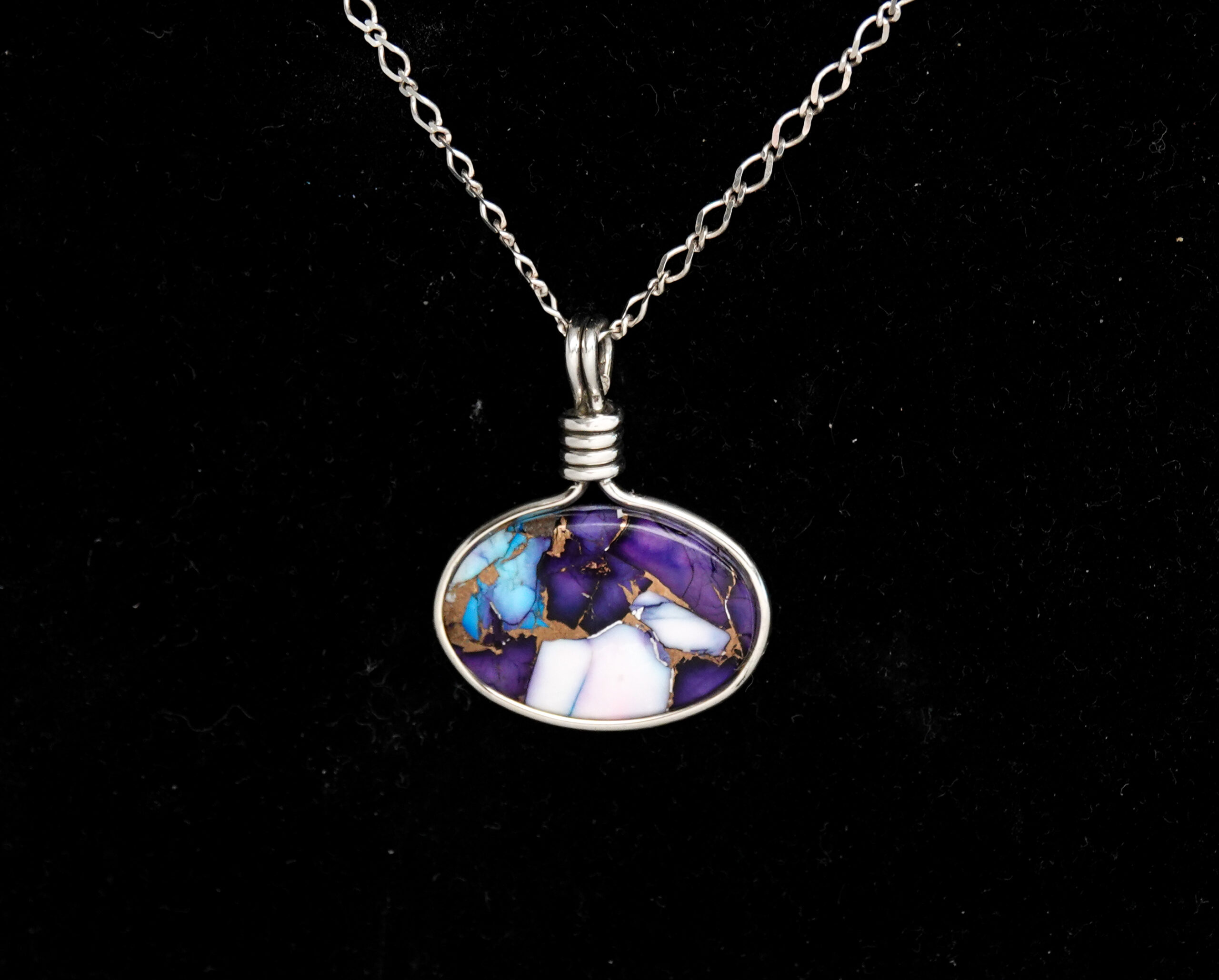 The joyful colors of purple, sky blue, gold and snowy white, in our one-of-a-kind Spring Blossoms necklace, are is reminiscent of the beauty of crocuses blooming out from the snow, welcome harbingers of spring. The sterlling silver 1 5/8- inch by 1-inch pendant features 15 carats of a Spiny Oyster, Turquoise