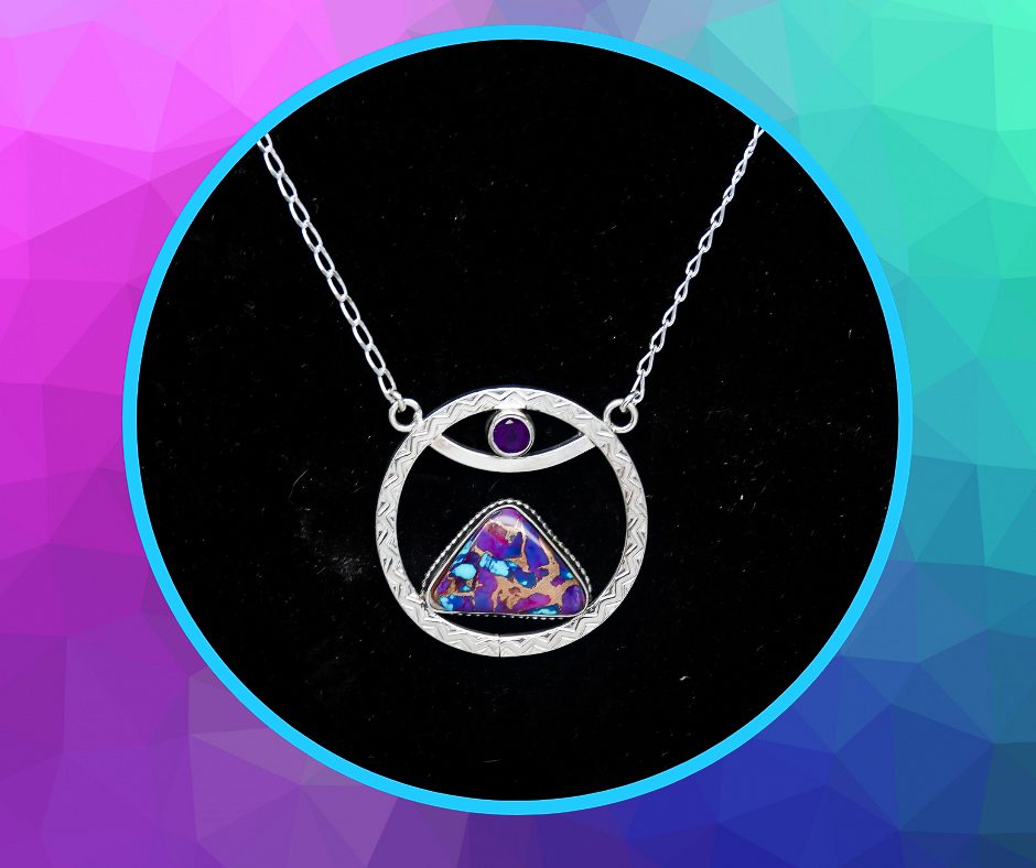 The tiny acorn grows into a magnificent oak tree, which then, in a full circle of life, brings forth more acorns and the eternal dance in nature continues. Our Full Circle Necklace comes in two styles. One is a 1 1/4 by 3/4-inch sterling silver & hematite gemstone pendant on an 18-inch sterling silver chain. In our second style, the pendant is suspended on a sterling silver bar/festoon, with the necklace measuring 18-inches, which is classic pendant length. A tiny, sterling silver tag bears our Dreamscape Jewelry Design logo, ensuring this is an original design.