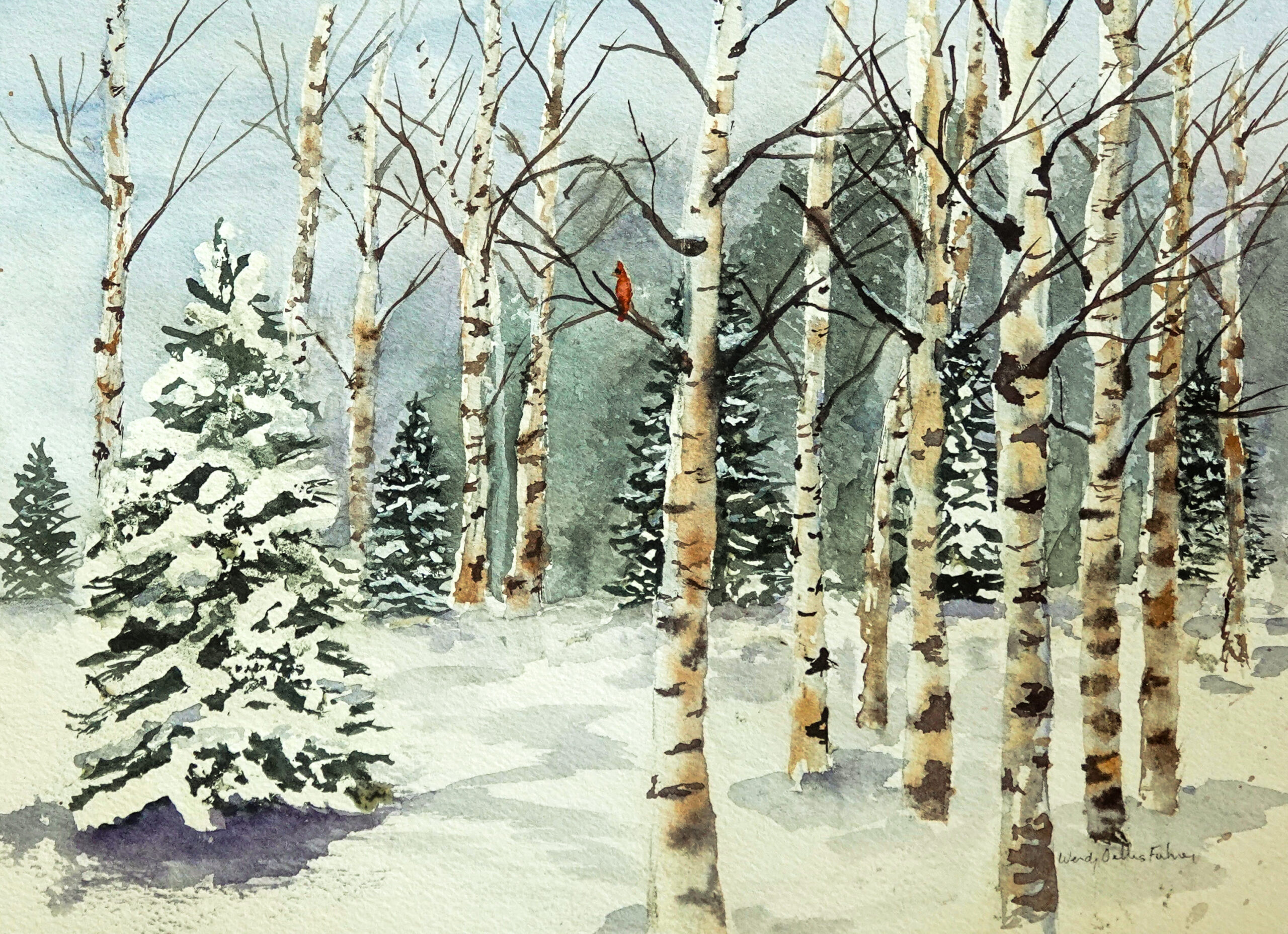 Our original watercolor of a Winter scene features both Birches and a Northern Cardinal. The Birch tree is an elegant symbol of nature. The silvery white bark looks sophisticated and graceful, but under this beauty there exists a strong, wilfulness to grow where nothing else can. One of the first species to regrow in places of a forest, it can thrive in harsh conditions of low nutrient soils and colder climates.In Spring, it’s one of the first trees to regrow leaves. The cardinal also has a number of poignant symbols. It is seen as a symbol of hope and joy, new beginnings, particularly during challenging times like during the bitter cold of winter.