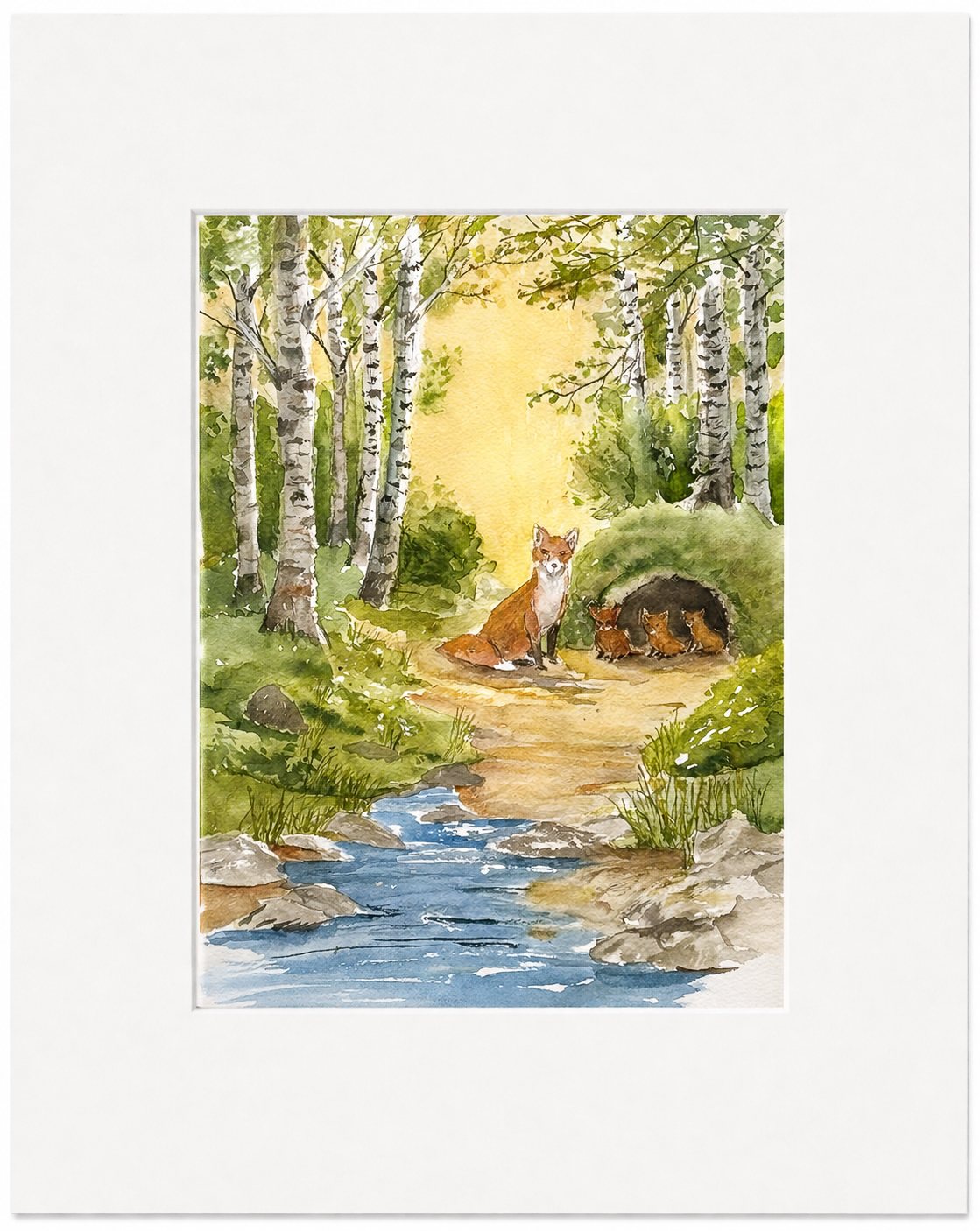In this luminous woodland scene, a red fox sits watchfully at the entrance of her den as her kits gather close beside her. Surrounded by birch trees and soft morning light, the moment feels both tender and protective—an expression of instinct, care, and the quiet strength of motherhood.