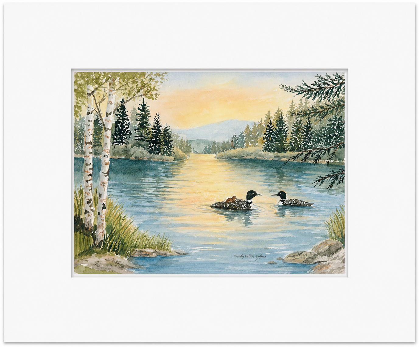 In this peaceful lakeside scene, a pair of loons glide across softly glowing waters, their reflection carried in the stillness of early morning light. Surrounded by birch trees and distant evergreens, the moment feels unhurried—rooted in connection, presence, and belonging.